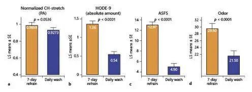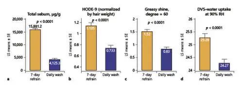 也就是说,相比 7 天不用洗发水的人相比,每天用洗发水洗头,不管是油脂、头屑和气味的各个维度上都显著变好了。