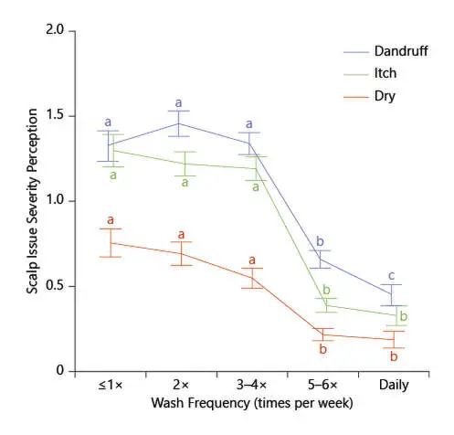 在对这项通过 1500 人受试者的打分分析后,研究人员发现,随着频率的增加,自我感知的头屑、瘙痒和干燥程度在统计学上显著降低。