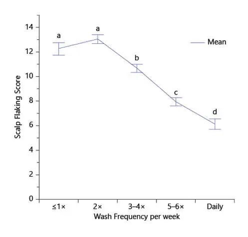 研究人员根据清洗频率,对头皮的剥落评分进行了分级,发现头皮剥落的严重程度随着清洗频次增加而显著降低了。